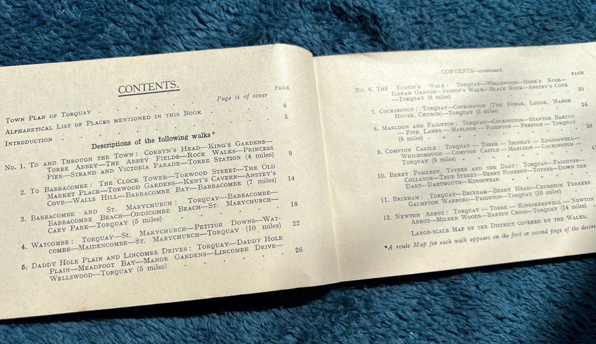 Fascinating booklet of 12 "of the most picturesque walks" that could be done from a base in Torquay with the use of buses,trains and boats.