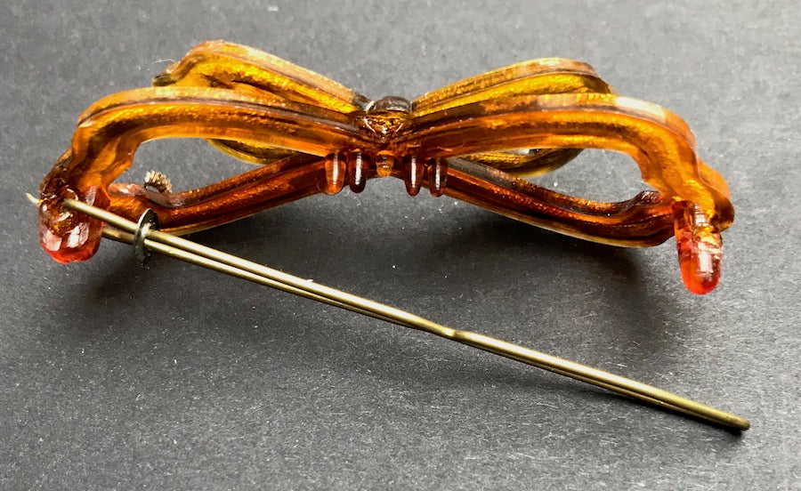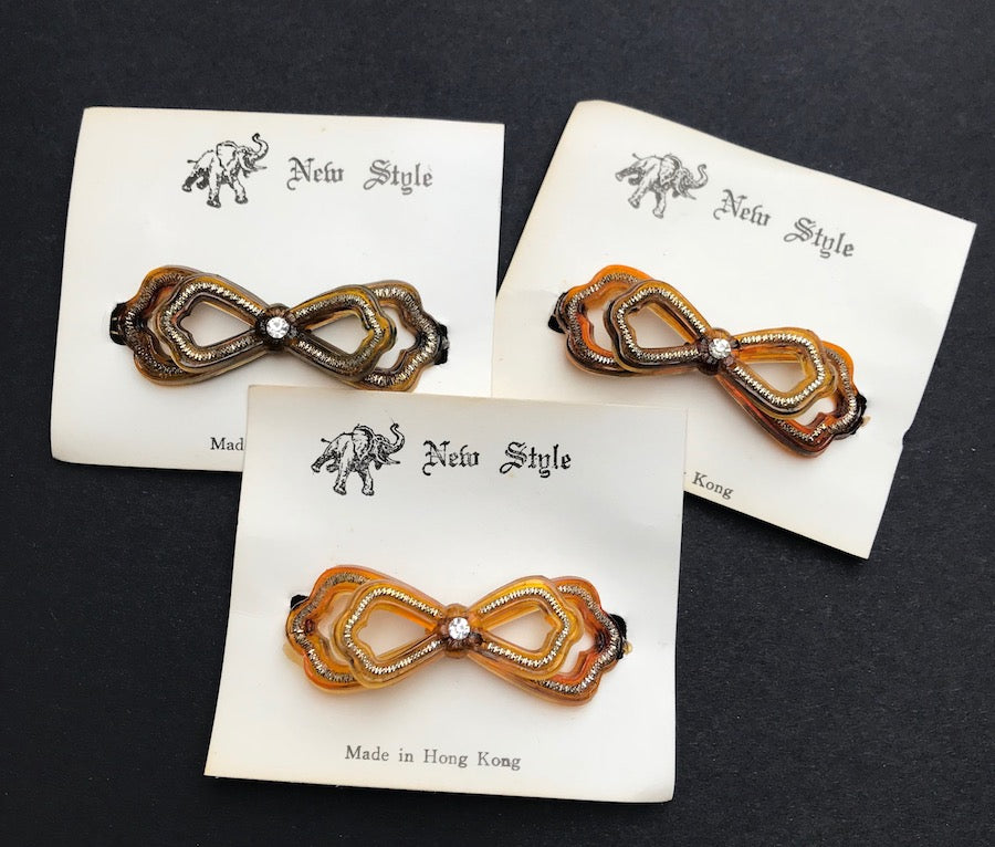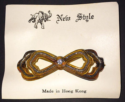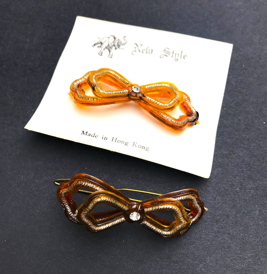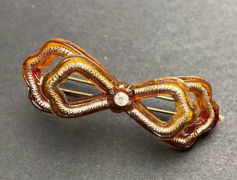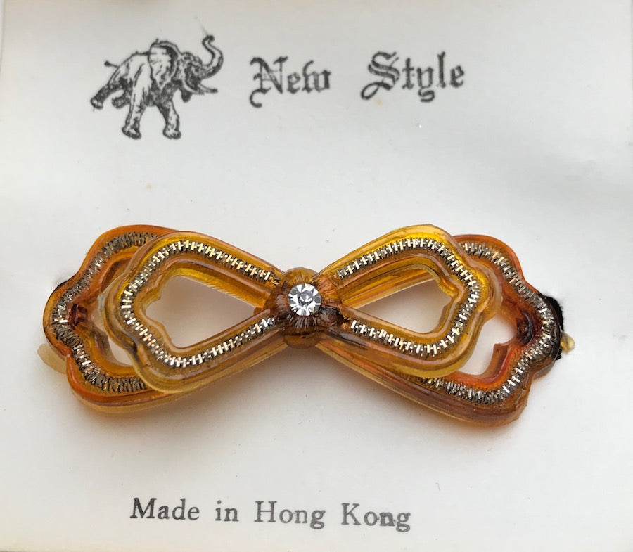 A gorgeous unused 1940s lucite and diamante bow shaped hairclip.