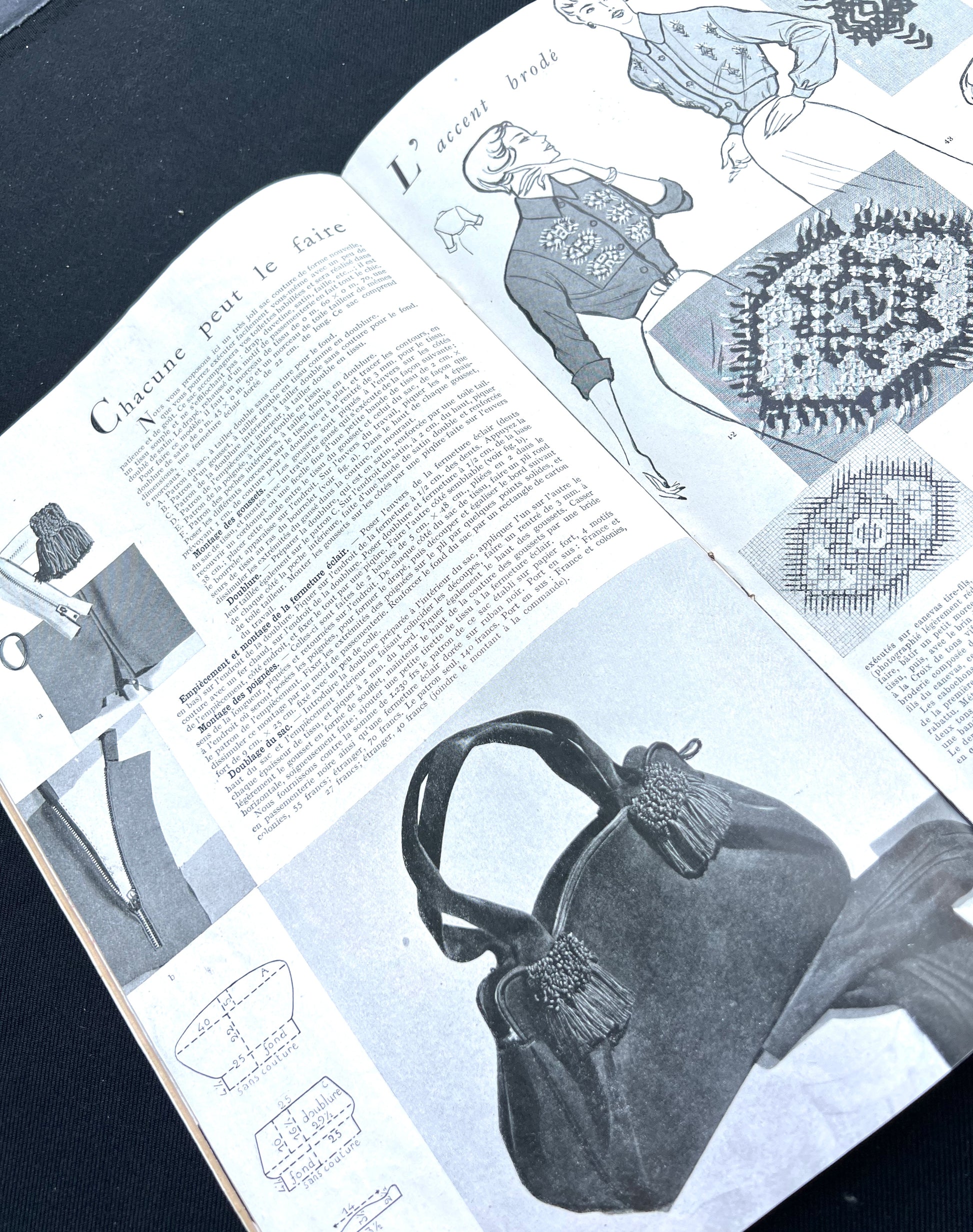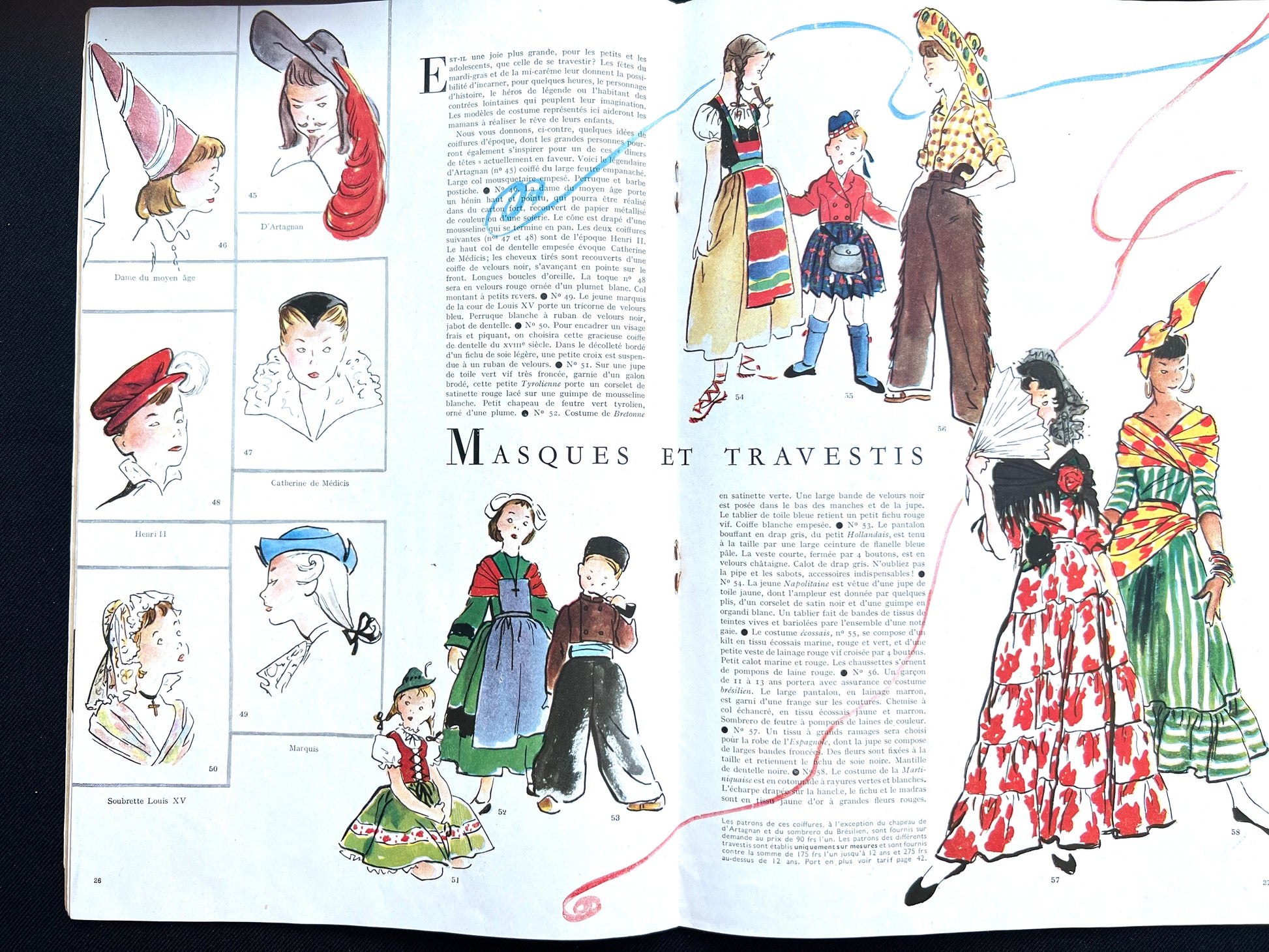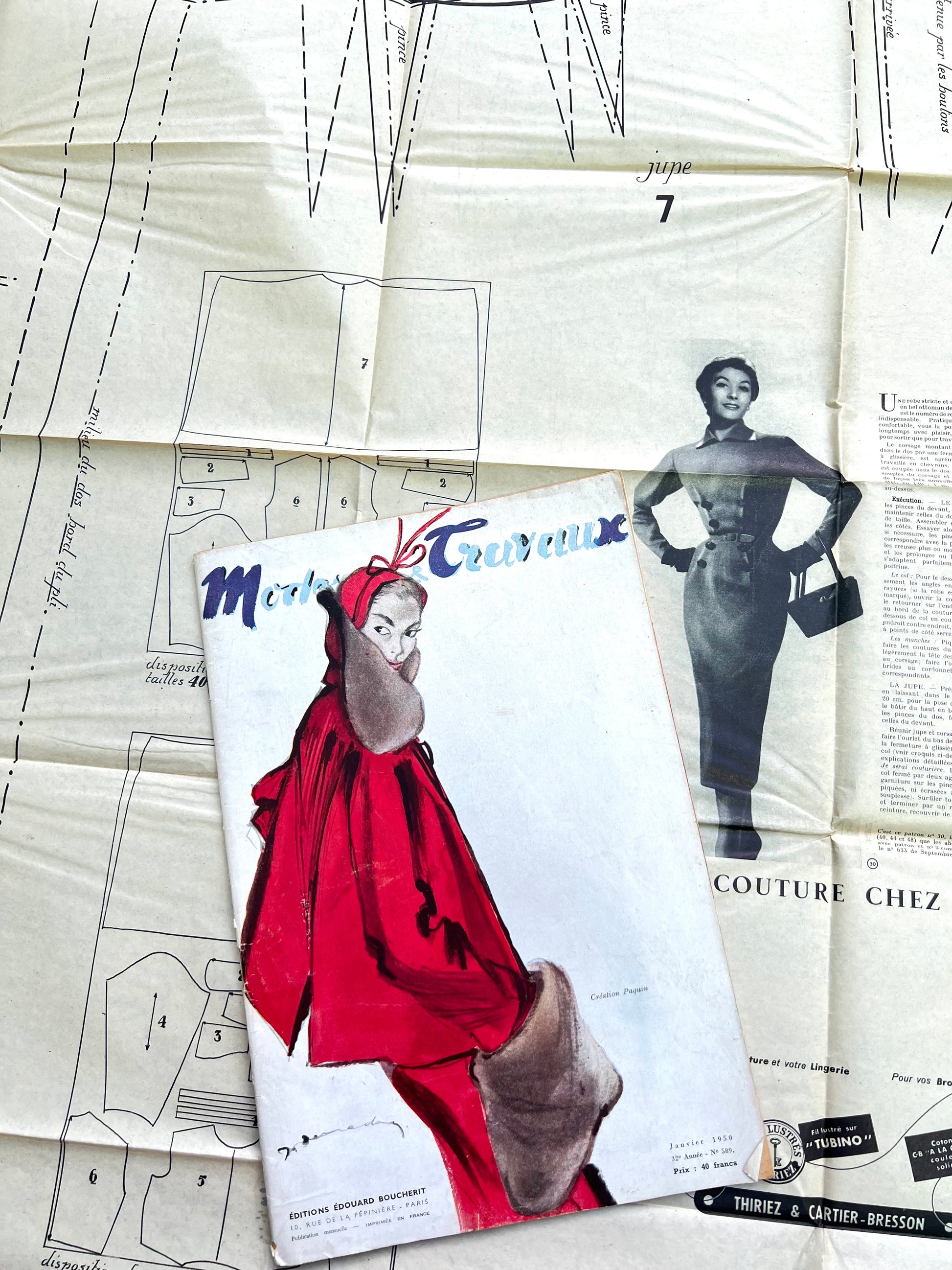 This January 1950 issue of the French Fashion Paper Modes & Travaux (issue 589)has 50 pages (29cm x 20cm) of colour and black and white illustrations of clothes that could be made from that seasons dress patterns. And there is a pattern insert to get you started !