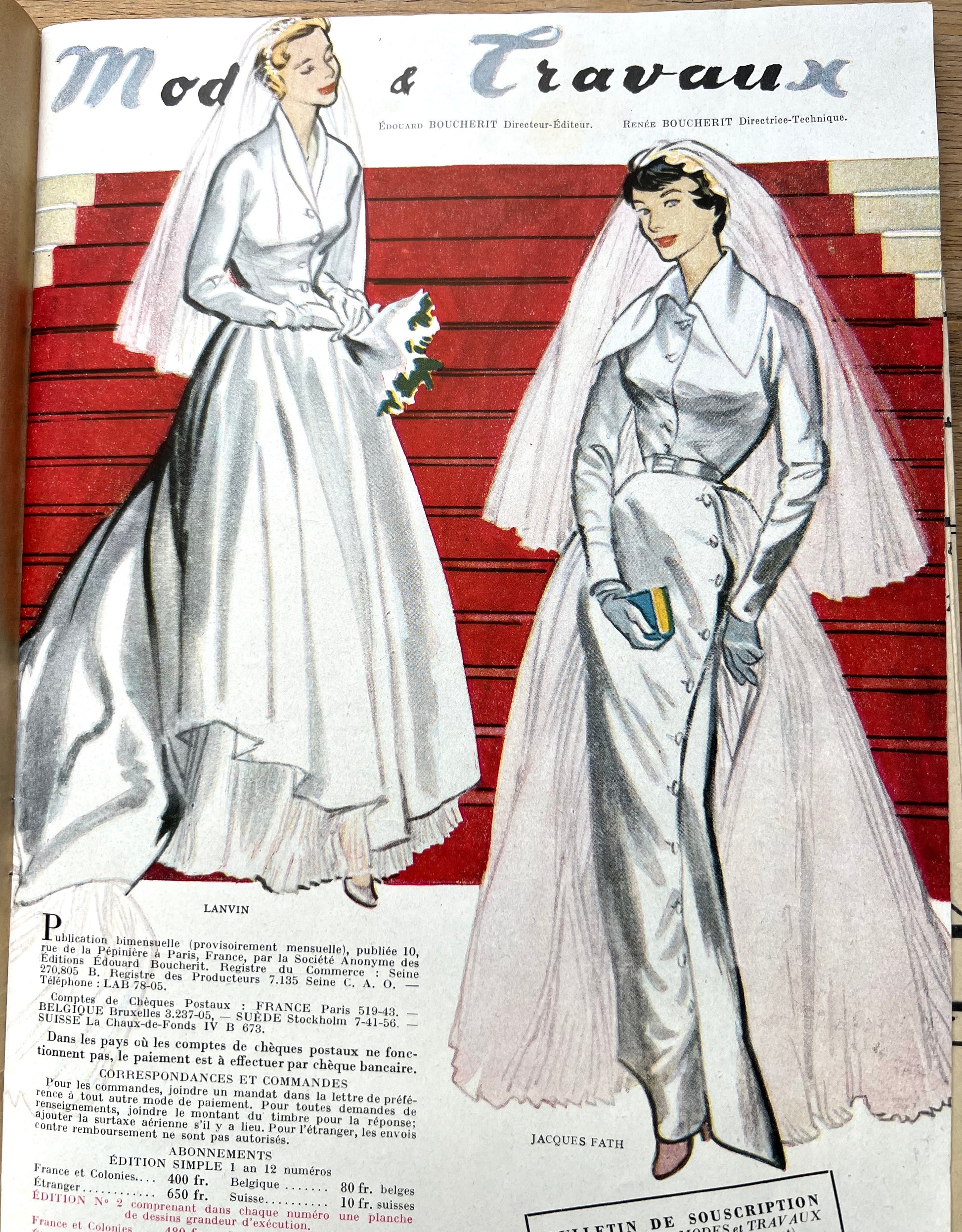 DEMACHY-PATRON Illustration on Cover of January 1950 French Modes & Travaux incl Dress Pattern + Designer Wedding Dresses