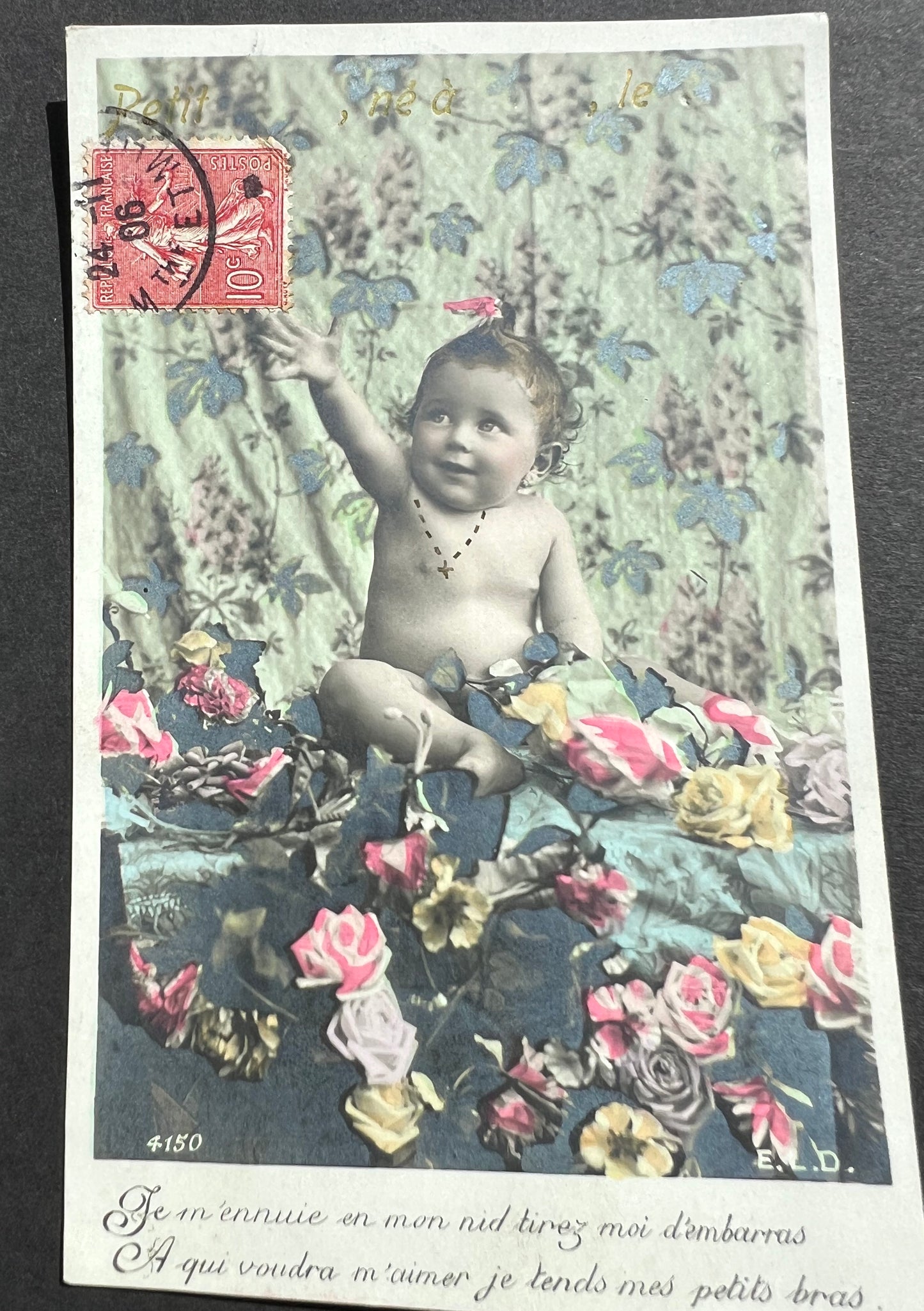 5 happy French postcards of a jolly baby sitting on a bed of flowers.