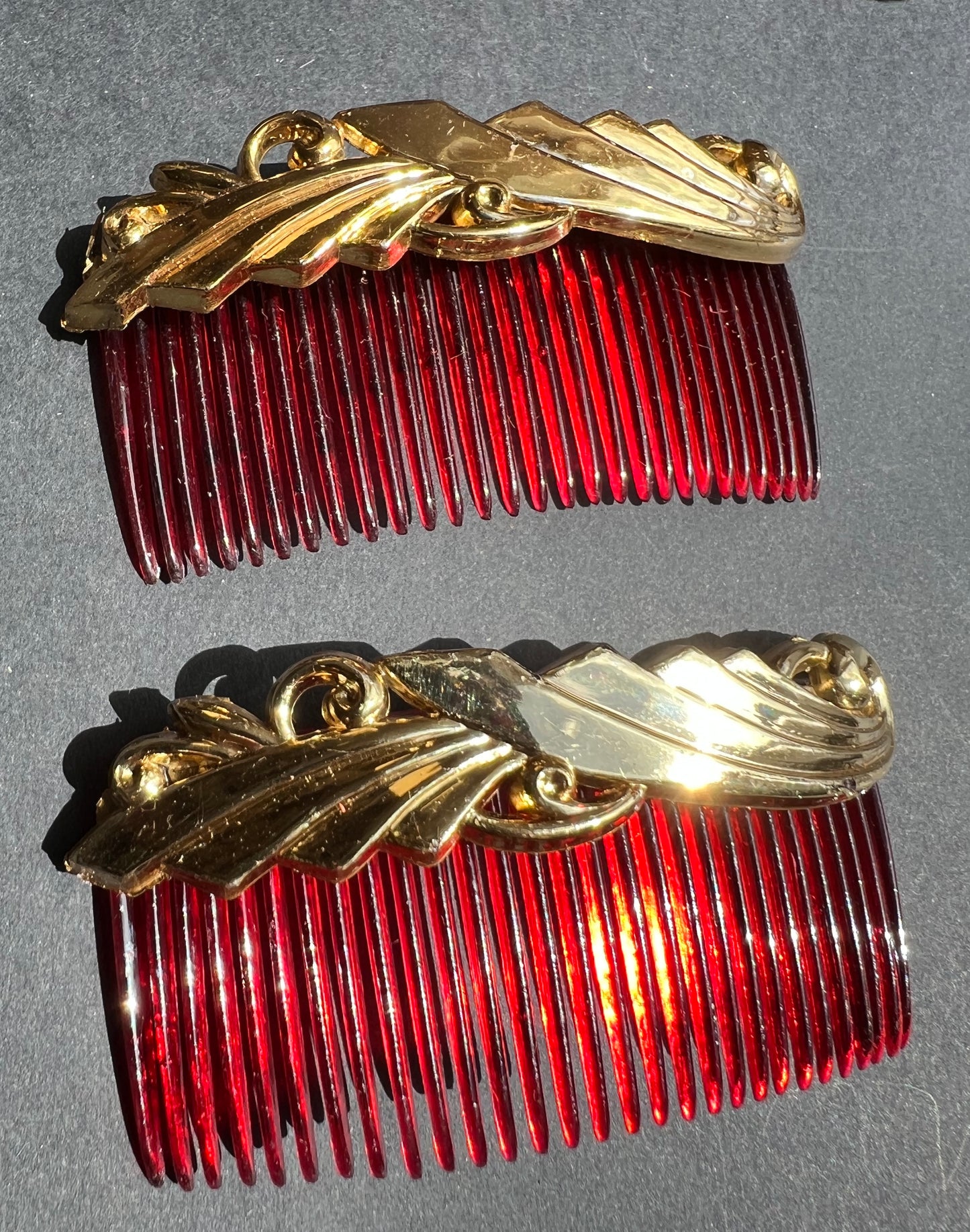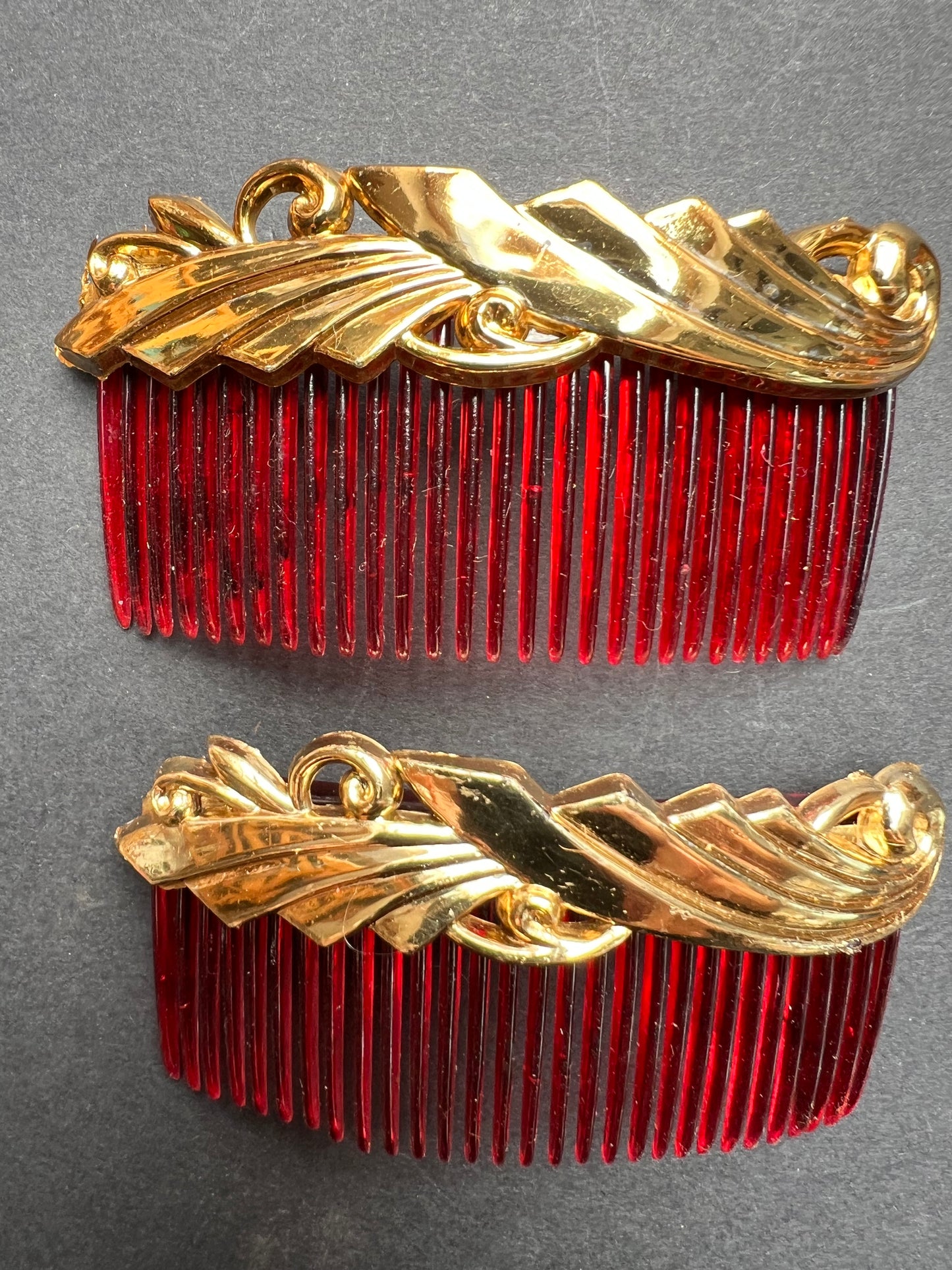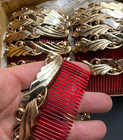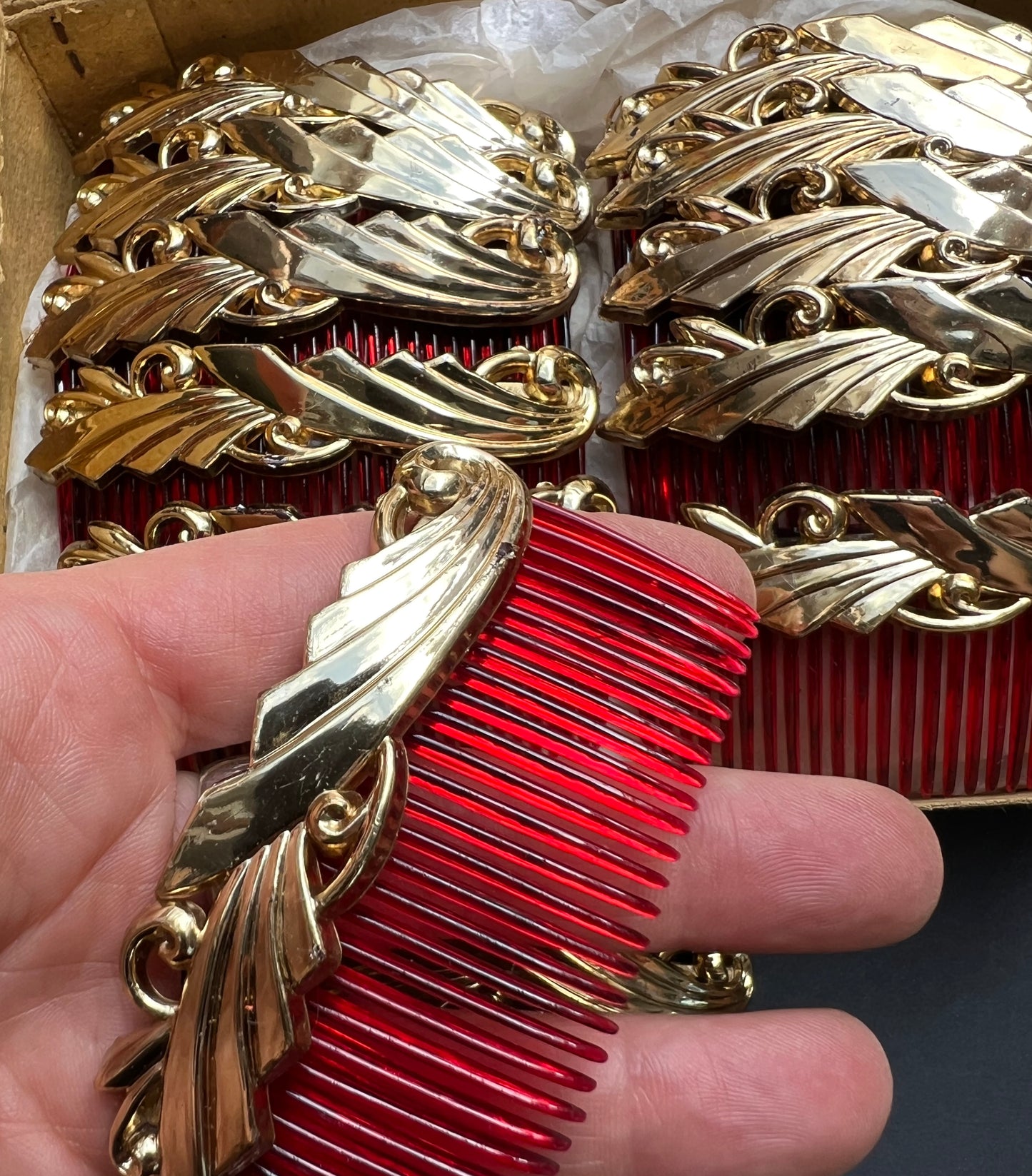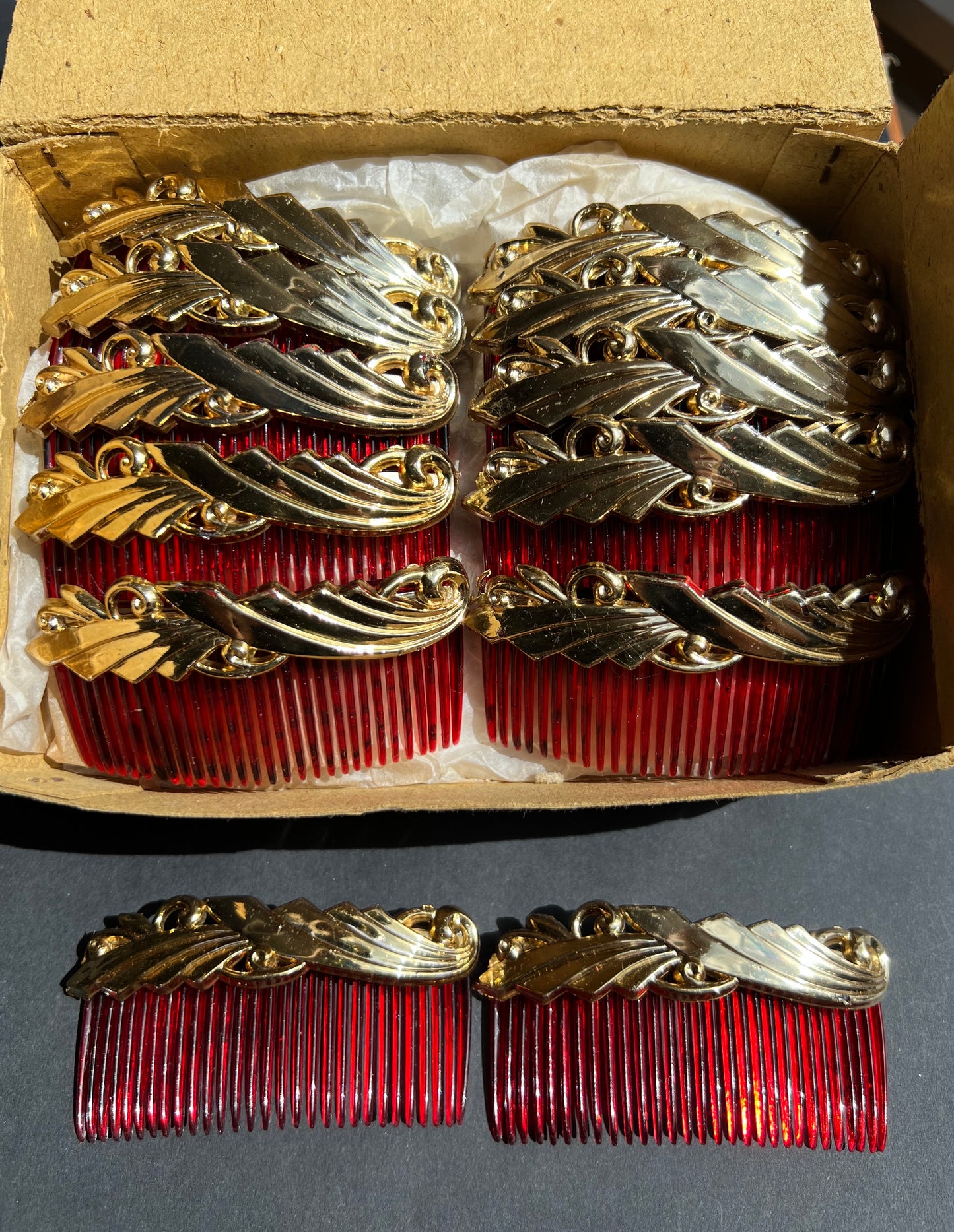 A box of 36 dramatic tortoiseshell and gold hair combs.