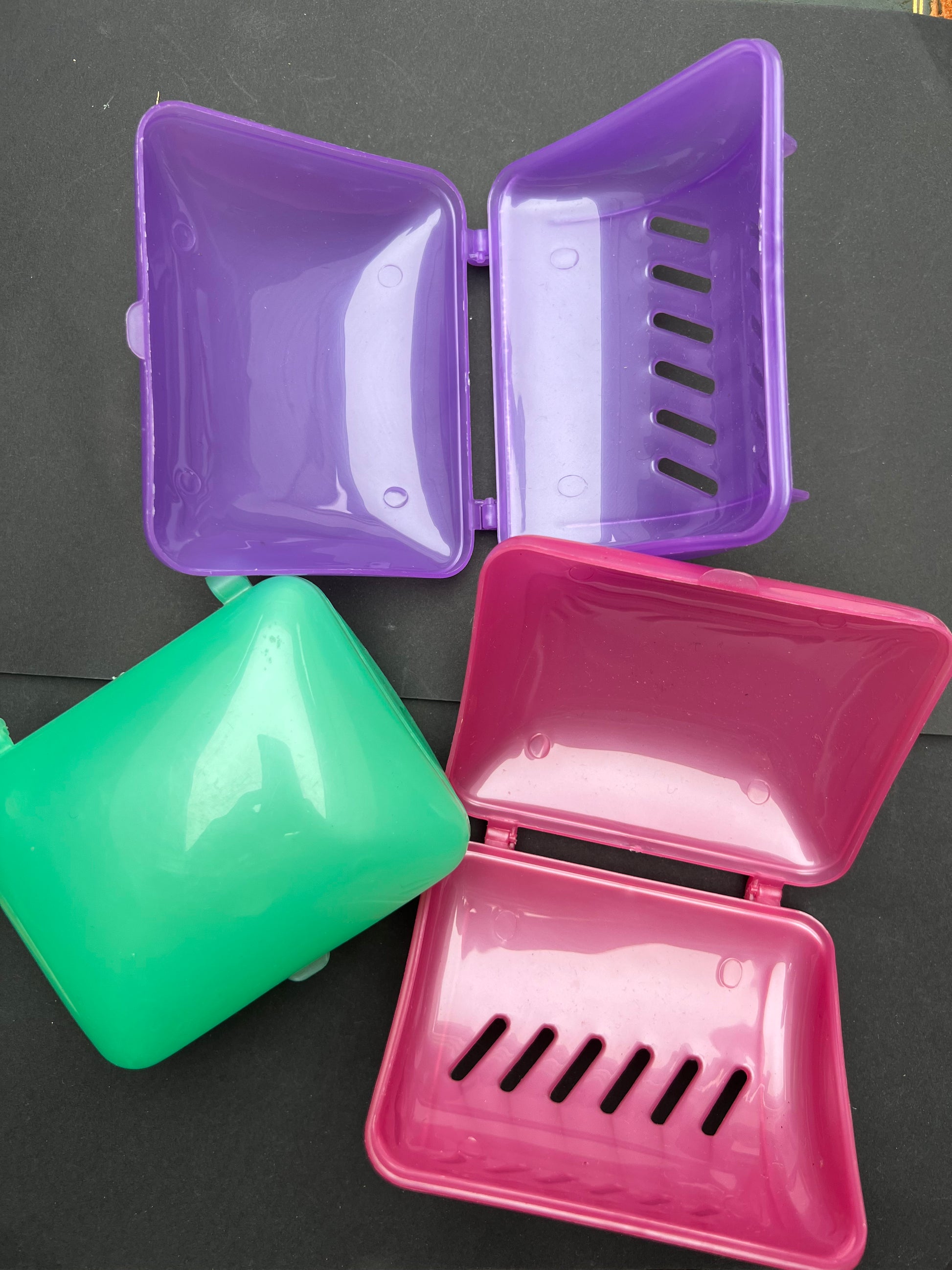 Sitting on little legs, with holes in the base to drain the water, a snap shut lid to stop your soap from escaping, and suitably bright colours, so you can always find it..this is the Ultimate Soap Dish.